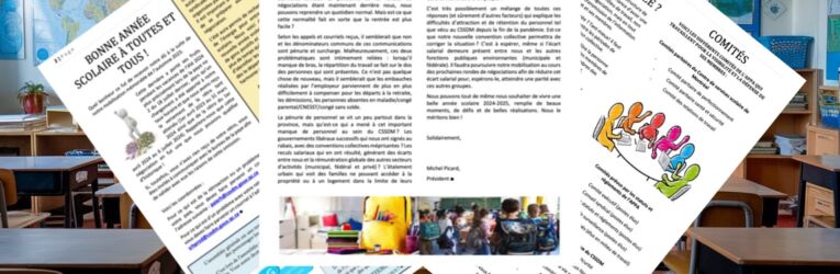 Mot du président | Retour sur les élections | Avez-vous un délégué dans votre lieu de travail | Journée nationale du personnel de soutien scolaire | Marche mondiale des femmes | Saviez-vous que ? | Journée de l’écoute | La grande semaine des tout-petits | Information importante de notre régime d’assurances collectives | Campagne CSN Faire front | Colloque de l’APPA 2026 | Campagne Osez le donner |