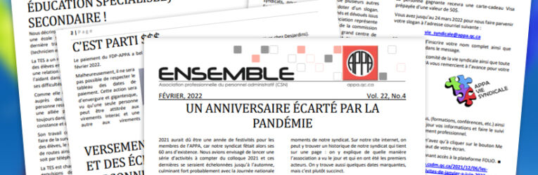 Un anniversaire écarte par la pandémie | FDP c’est parti $$$ | Versement de la majoration des taux et des échelles salariales pour le personnel de soutien | La journée d’une TES dans une école secondaire | Colloque 2022 annulation | Concours « un slogan pour l’APPA » | Plateforme Folio