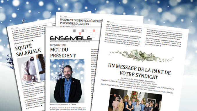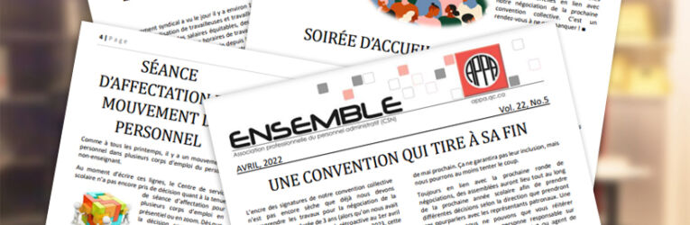 Une convention qui tire à sa fin | L’importance de s’impliquer dans la vie syndicale | Soirée d’accueil des nouveaux membres | Paiement du FDP-APPA | Assurance collective SSQ | Séance d’affectation et mouvement de personnel | Devenez journaliste d’un jour | Appaide (recrutement de personnes entraidantes)