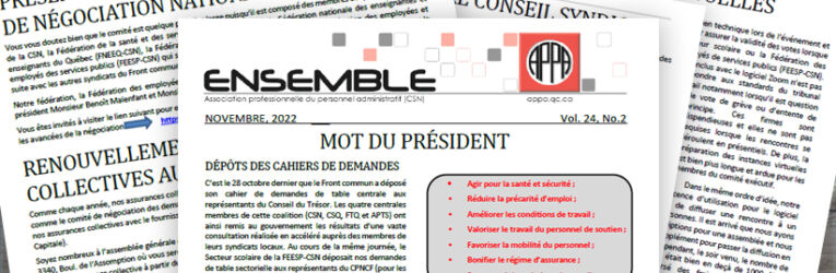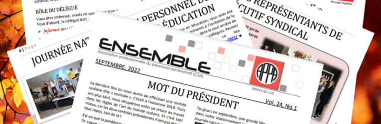 Mot du président | Présentation des représentants de votre exécutif syndical | Élections d’automne 2022 | Élection de la personne déléguée de votre milieu de travail | Clinique d’aide à la retraite | Journée nationale du personnel de soutien en éducation | « Plus fort ensemble », le nouveau slogan de l’APPA | « Samedi » de jaser diversité | Salut à toi « jeune membre »