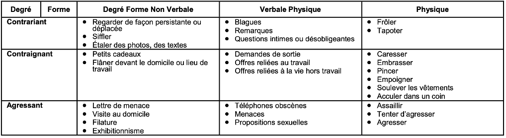 Le tableau ci-dessous présente les formes de harcèlement et de violence selon le degré.